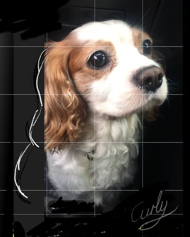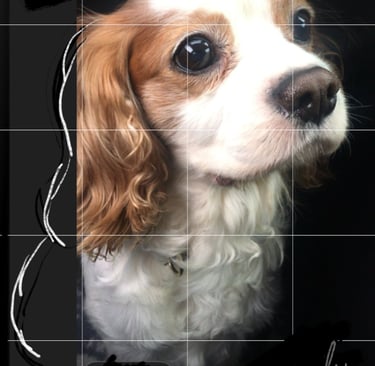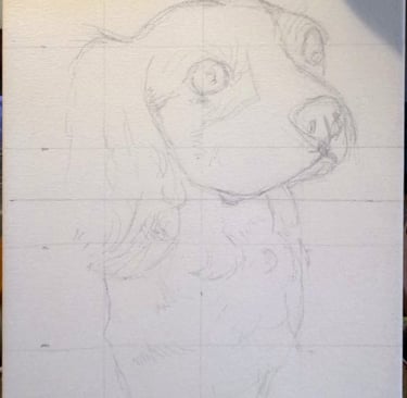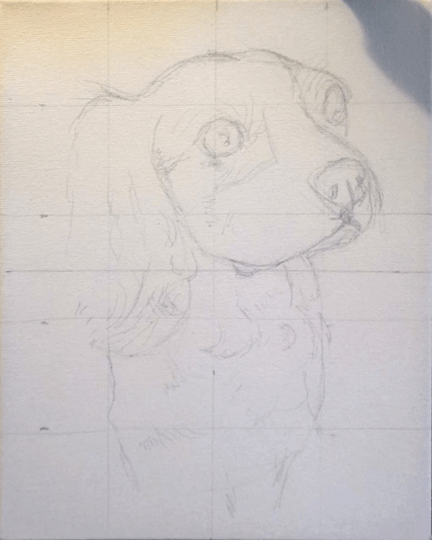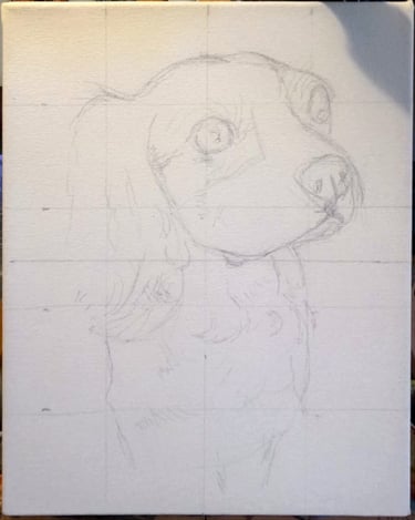 Before any paint touches the canvas, I carefully sketch the portrait using the grid technique. This allows me to accurately transfer proportions from the reference image while maintaining the natural anatomy of your pet. Im not sure if this is an "official" method name, but you'll see why I call it that.