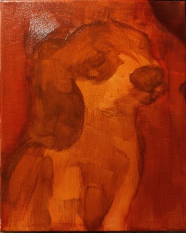 A warm colour here really filters through the whole image. Acrylics are never really fully opaque, each layer has an effect on the ones above. doing layers like washes helps build depth. If you use a cool colour wash it will come through as a muted and cold portrait in the end, great for certain landscapes or ideas but not necessarily the love for a pet!